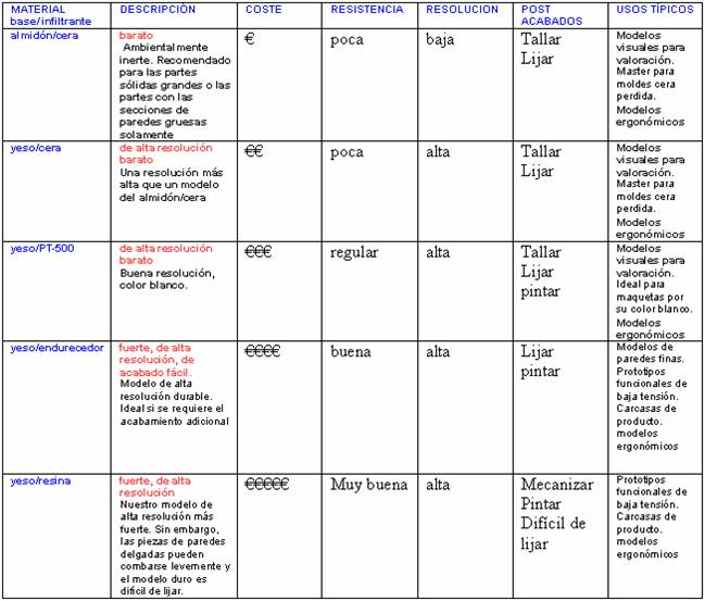 Tenemos dos materiales básicos para la construcción de las piezas. El Almidón y el yeso. El almidón es generalmente bueno para los modelos grandes y con espesores de más de 5 mm donde es menos importante el detalle fino. El yeso proporciona una resolución mejor y se puede infiltrar con materiales más fuertes.